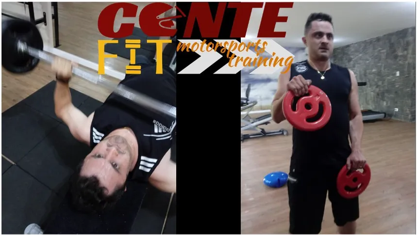 Piloto Fáio Pasqualino – Kart 125 cc atleta do nosso Programa de Exercícios da Conte Fit realizando treinamento com pesos para os membros superiores e tronco (Imagem: arquivo do autor).